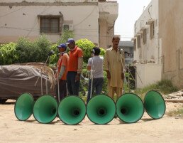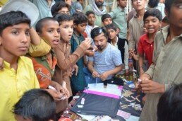 The main objective of this project has been to overcome stalled political parameters of mutual distrust and enmity between the people of Afghanistan and Pakistan. With two artists from Afghanistan and three from Pakistan, the Taaza Tareen residents have emphasized in their work how critical it is to involve the general public with art as these initiatives have the capacity to mobilize and transform society’s perspective on politics and social constraints. By developing the concept of Social Sculpture during the 1970’s, German artist Joseph Beuys established a very broad and political understanding of art. Art, in his regard should not be reduced to material artefacts that form a visible final “product” and be exhibited in galleries and museums. Through this understand of social sculpture, the five artists in residence have worked towards creating interactive pieces of art which are mindful and reflective, concentrating on new ways of thinking. During the period of this month long residency, the artists have developed their process throughout the city of Karachi at multiple locations, interacting with people from various economic and geographical backgrounds. The outcome from their residency has been nurtured and mentored through weekly sessions with Professor Shelley Sacks, Director of the Social Sculpture Unit at the Oxford Brookes University, U.K..