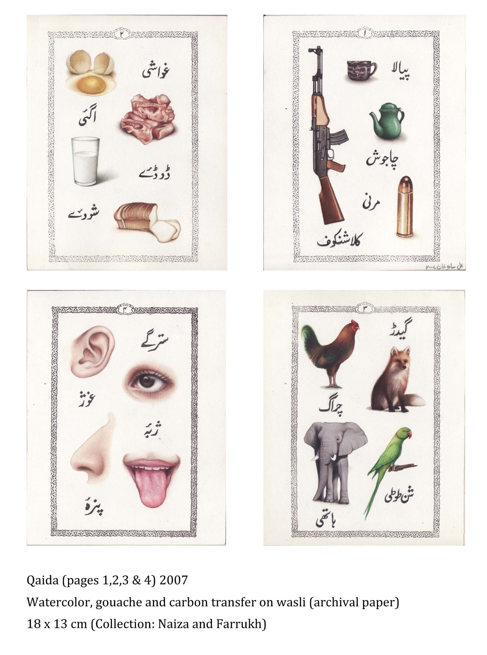 Sara Khan Pathan, a fine artist/ creative educator, a distinction graduate of University of Karachi, has over the years become a thriving multi-disciplinary artist. Her work is mainly an amalgamation of portraits, fusion of text, unambiguousness of walnut shell, plastic toys, bullets and pellet gun shot drawings; beautifying the rage rather than creating a revolting effect, depicting through satire the commonality of social aggression that is prevalent in an uneven progression.